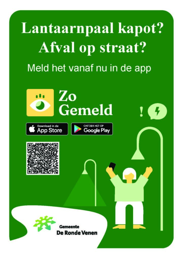 Maandag 3 november gaat de app ‘Zo Gemeld’ live in De Ronde Venen. Met de app kunnen inwoners snel en gemakkelijk meldingen doen die betrekking hebben op de openbare ruimte. Dit kan bijvoorbeeld gaan over kapotte straatverlichting, overlast, een gevonden fiets, een vies speeltoestel, zwerfafval, een dood dier in de berm of een losse stoeptegel. Melders hoeven geen account aan te maken, zij kunnen met de app direct starten met het maken van een melding. Wie een e-mailadres achterlaat, wordt per e-mail op de hoogte gehouden van de status van hun melding. Zo ontvangen zij dus ook een e-mail als hun melding is afgehandeld.