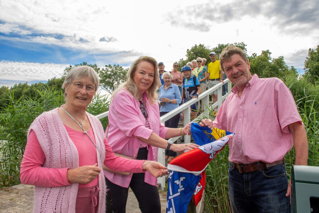 Fotobijschrift: Samen met Liesbeth Hengeveld (links) van de Ouderen Belangen Vereniging Abcoude-Baambrugge (OBV) en Maarten van Dijk van Spaar het Gein onthult wethouder Vijselaar het informatiebord bij de Wilhelminabrug in Abcoude.